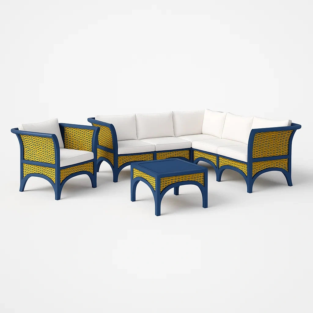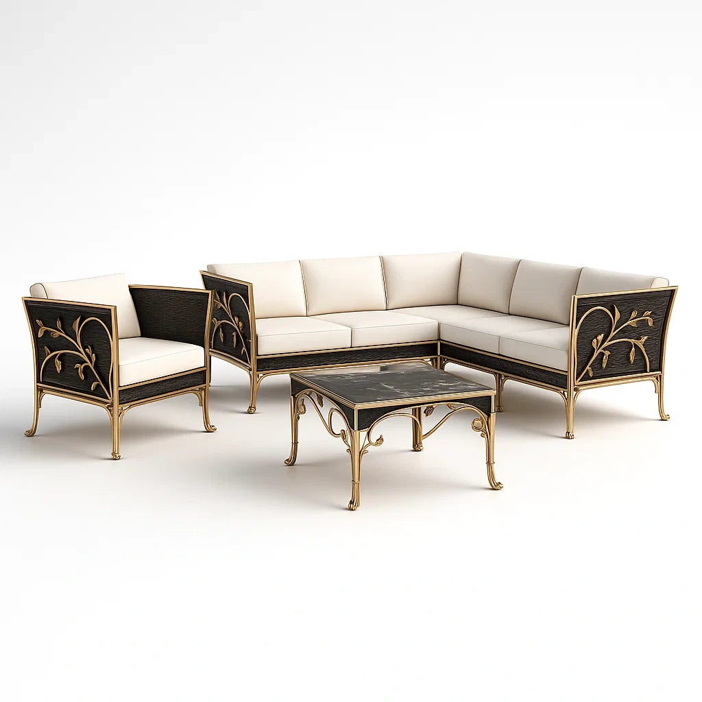 Avec des coussins beiges et une table d'appoint assortie. Confortable et aéré, il est prêt à embellir votre intérieur.